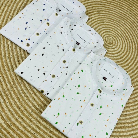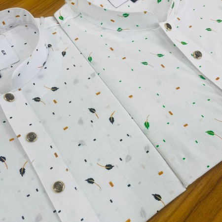 Experience comfort and style with this premium Pure Cotton Panjabi, designed with an elegant black leaf print on a crisp white base. The soft and breathable fabric keeps you fresh all day, while the metal-finish buttons and band collar add a refined, modern touch. Ideal for casual wear, office styling, weekend outings, and festive moments.